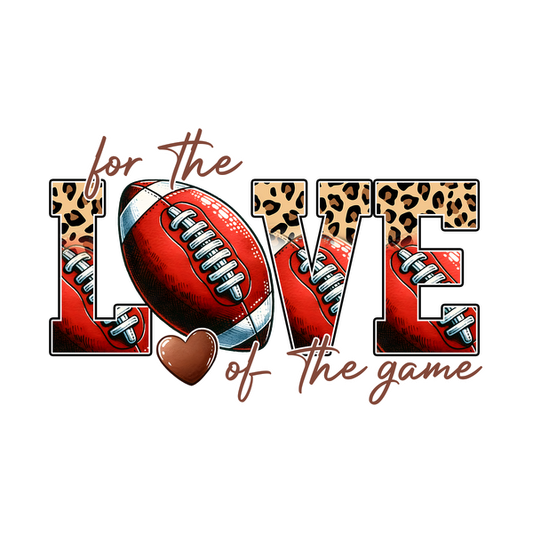 A playful design featuring the phrase "For the Love of the Game" with footballs and a leopard print pattern. dtf transfers