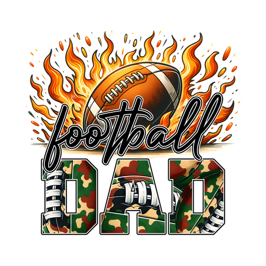 A vibrant design featuring a flaming football with "football Dad" in bold, camo-patterned letters, perfect for sporty dads. dtf transfers