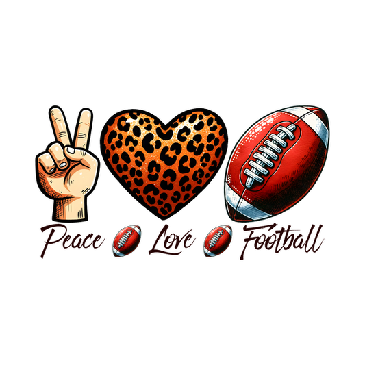 A vibrant graphic featuring a peace sign, leopard print heart, and football, celebrating "Peace, Love, Football." dtf transfers