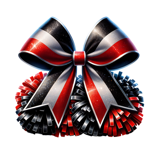 A vibrant decorative bow with red, black, and silver stripes, accompanied by fluffy pom-poms in coordinating colors.DTF Transfers dtf prints