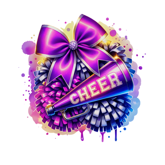 A vibrant cheerleading design featuring a purple megaphone with "CHEER" text, surrounded by colorful pom-poms and a glossy bow.DTF Transfers heat press transfers