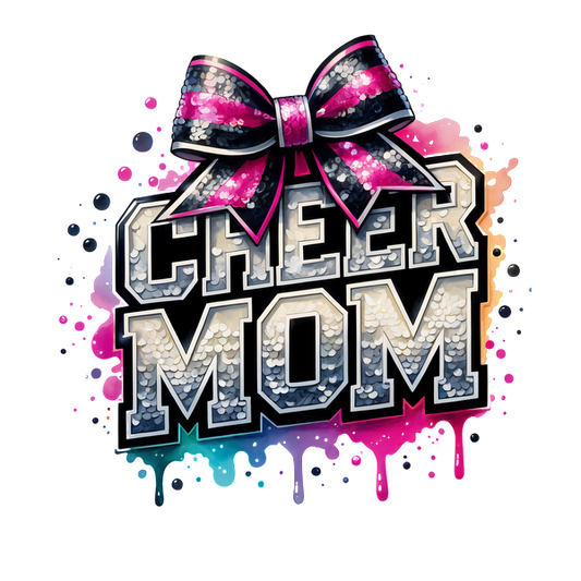 A vibrant graphic design featuring the words "CHEER MOM" adorned with a shiny bow and colorful splashes, celebrating cheerleading pride.DTF Transfers dtf transfers