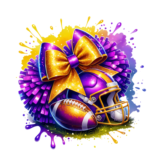 A vibrant illustration featuring a purple football helmet, a football, and a large decorative bow with colorful pom-poms.DTF Transfers dtf prints