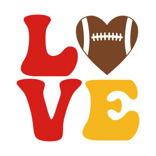 A colorful "LOVE" graphic featuring a heart-shaped football, perfect for sports enthusiasts and showing team spirit.dtf regular iron