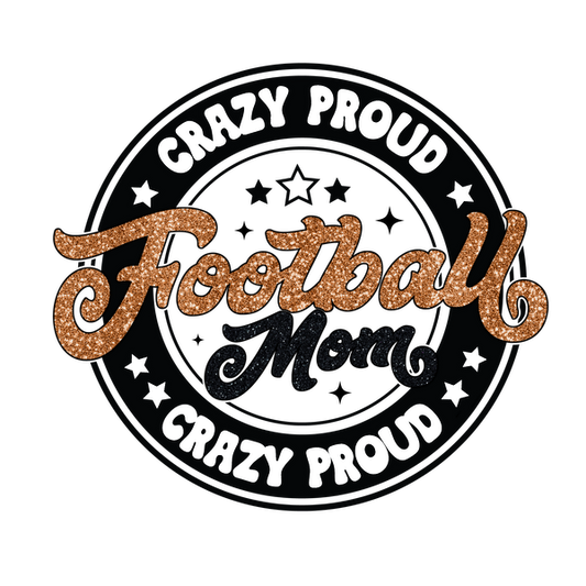 Shiny and stylish design with "Football Mom" text, celebrating a proud sports mom's spirit in sparkling colors. heat press transfers