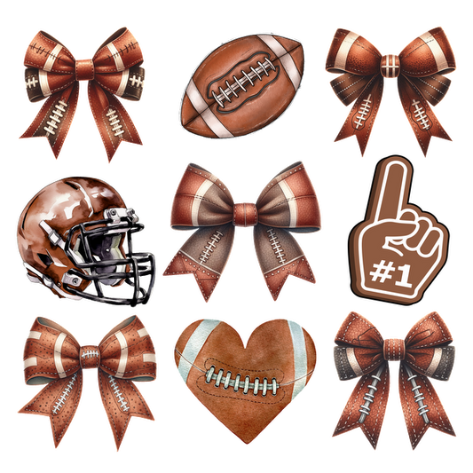 A fun collection of football-themed graphics featuring bows, a helmet, and a foam finger, perfect for game day celebrations! heat press transfers