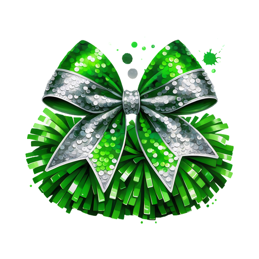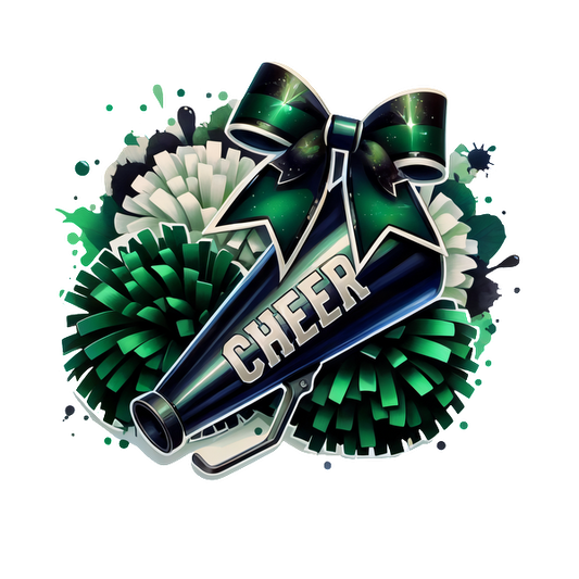 A vibrant cheer megaphone adorned with a bow, surrounded by lush green and white pom-poms, celebrating team spirit.DTF Transfersdtf regular iron