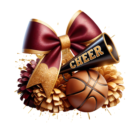 A vibrant cheerleading design featuring a megaphone, a basketball, and a decorative bow, perfect for sports enthusiasts.DTF Transfers dtf prints