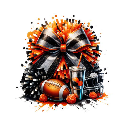 A vibrant football-themed arrangement featuring a large orange and black bow, a football, a helmet, pom-poms, and a drink.DTF Transfers dtf transfers