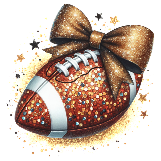 A sparkling, decorated football featuring a glamorous golden bow and colorful glitter accents, perfect for festive occasions.dtf regular iron