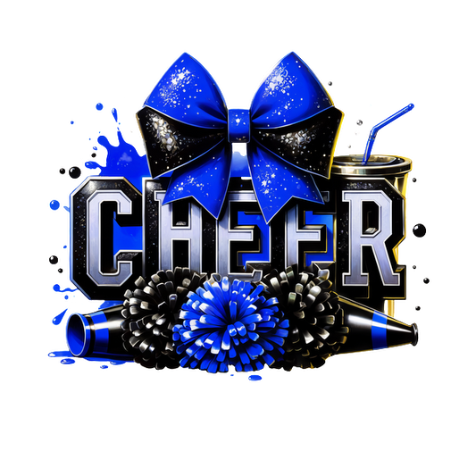 Celebrate in style with this vibrant "CHEER" graphic featuring a festive blue bow, pom-poms, and decorative elements!DTF Transfers dtf prints