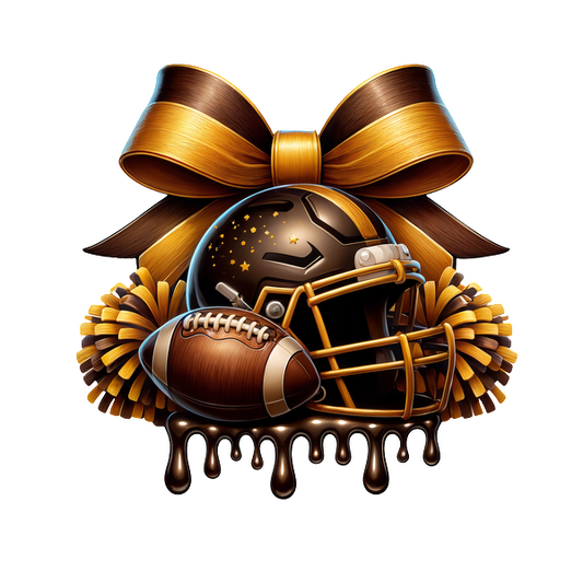 A festive design featuring a football helmet and football, adorned with a glossy gold and brown ribbon.DTF Transfers heat press transfers