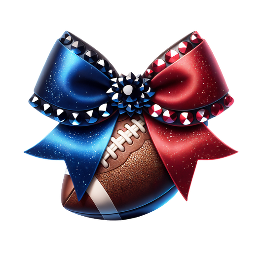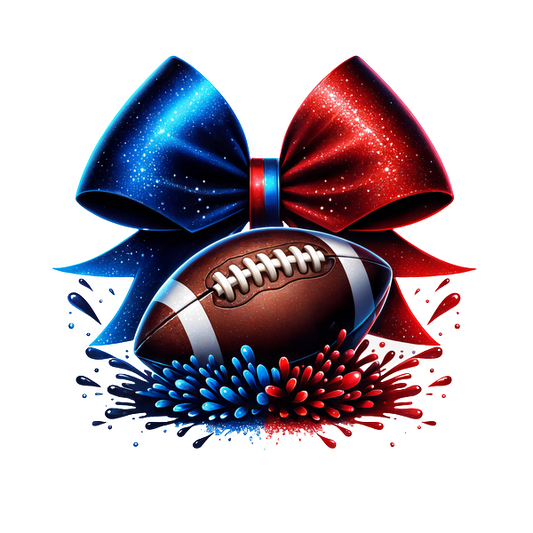 A vibrant illustration featuring a football adorned with a blue and red glittery bow, celebrating sports and festive spirit.DTF Transfers heat press transfers