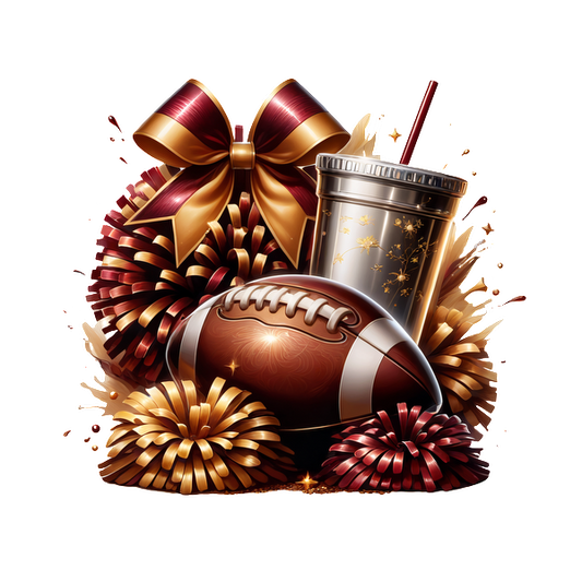 A festive arrangement featuring a football, a decorated cup, and vibrant bows and pom-poms in rich gold and burgundy colors.DTF Transfersdtf regular iron