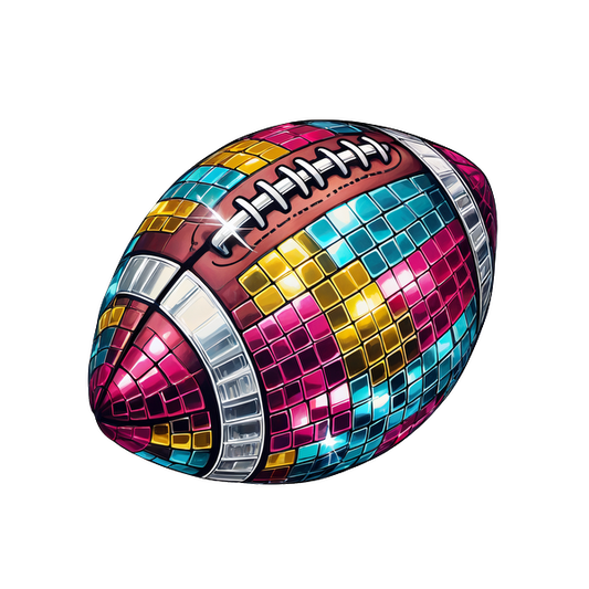 A vibrant, disco-themed football featuring colorful mirrored tiles in pink, blue, and yellow for a fun, eye-catching design.dtf regular iron