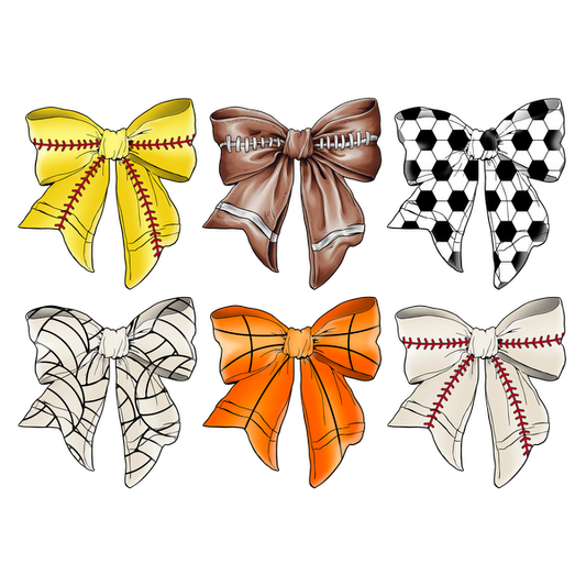 A colorful assortment of six sporty bows featuring designs inspired by baseball, basketball, football, and soccer. dtf prints