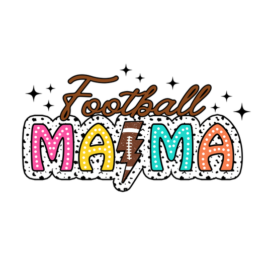 A colorful and fun graphic design featuring the words "Football Mama" with vibrant lettering and a lightning bolt accent. heat press transfers
