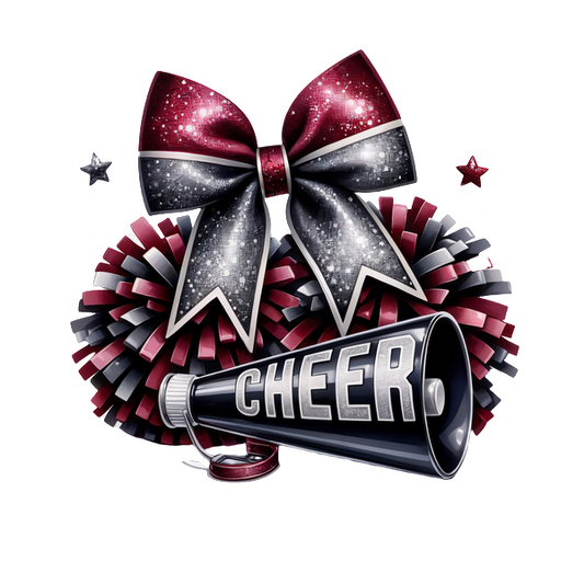 A vibrant cheerleading design featuring a glittery bow, pom-poms, and a megaphone emblazoned with the word "CHEER."DTF Transfers dtf prints