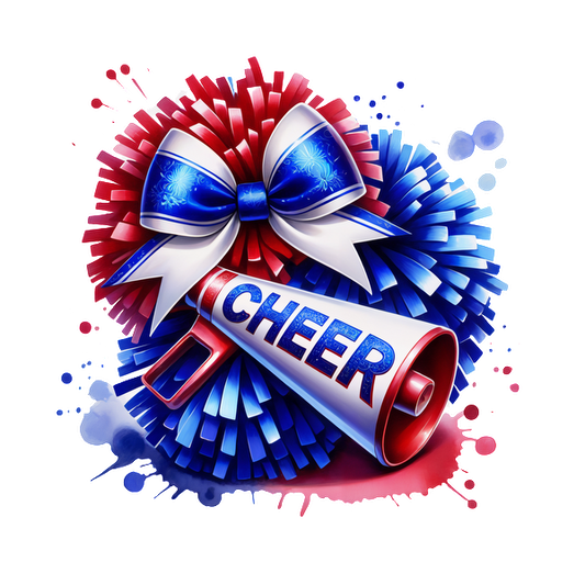 A vibrant cheerleading graphic featuring red and blue pom-poms with a "CHEER" megaphone and a decorative bow.DTF Transfers heat press transfers