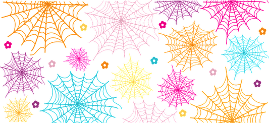 A vibrant assortment of colorful spider webs in pink, orange, yellow, and blue against a black background.UV Transfers heat press transfers