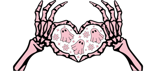 A playful design featuring pink skeleton hands forming a heart with cute ghosts and flowers inside.UV Transfersdtf regular iron