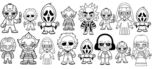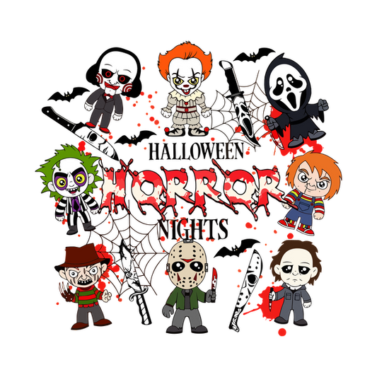 A colorful and playful illustration featuring iconic horror characters in chibi style, centered around the word "Horror" with spiderwebs. heat press transfers