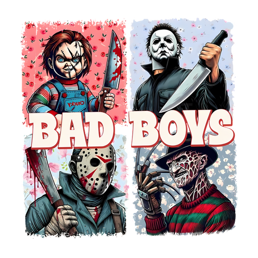 A vibrant graphic featuring iconic horror villains, including Chucky, Michael Myers, Jason Voorhees, and Freddy Krueger, with "BAD BOYS" prominently displayed. dtf transfers
