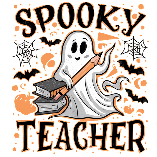 This fun design features a cute ghost holding a pencil and books, perfect for a "Spooky Teacher" theme!