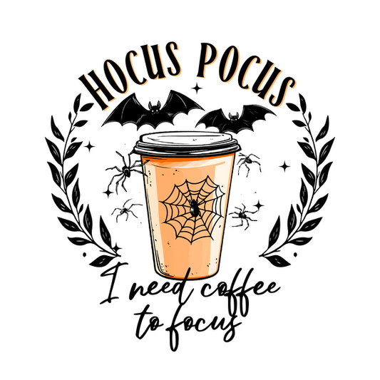 A whimsical autumn-themed coffee cup featuring a spider web design, bats, and the phrase "Hocus Pocus." heat press transfers
