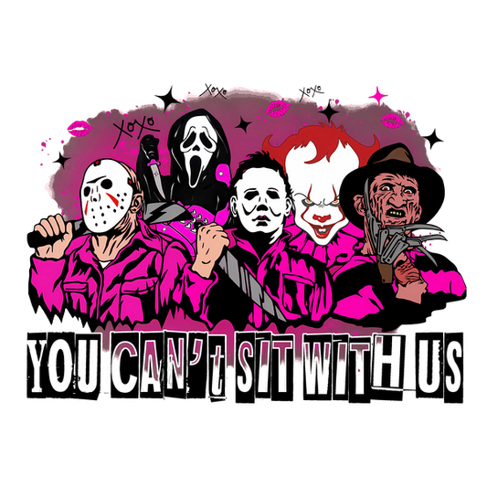 A vibrant graphic featuring iconic horror movie characters, dressed in pink outfits, with the phrase "You Can't Sit With Us." heat press transfers