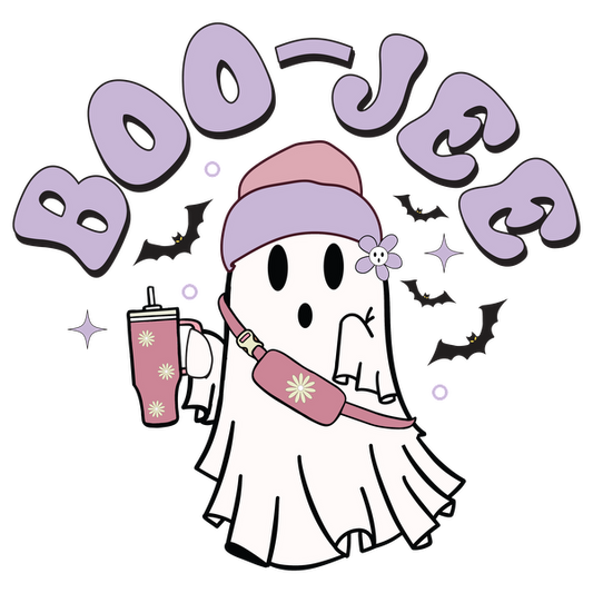 A cute, stylish ghost character holding a drink, wearing a pastel hat and accessories, with 'BOO-JEE' text in playful font.dtf regular iron