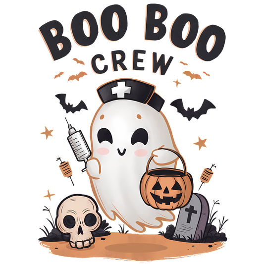 Prix habituel À partir de £0.75 GBPPrix habituelPrix unitaire / par£2.40 GBPPrix promotionnel À partir de £0.75 GBPA playful ghost in a nurse's hat, holding a pumpkin bucket and a syringe, surrounded by Halloween-themed decorations. dtf prints