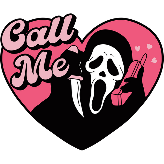 A playful heart-shaped design featuring a ghost face holding a knife and a phone with the text "Call Me."dtf regular iron