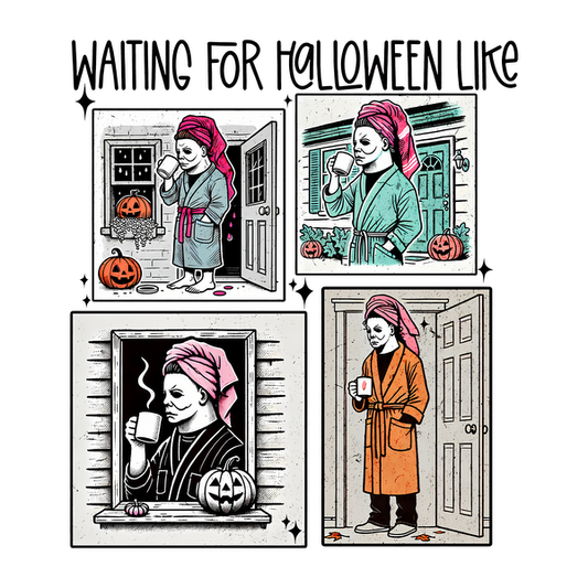 A quirky Halloween-themed illustration featuring a character in various bathrobes and a towel, enjoying drinks amid pumpkins.dtf regular iron