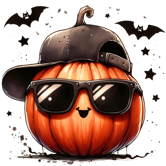 Meet this stylish pumpkin donning a black cap and cool sunglasses, exuding cheerful Halloween vibes with a playful smile! heat press transfers