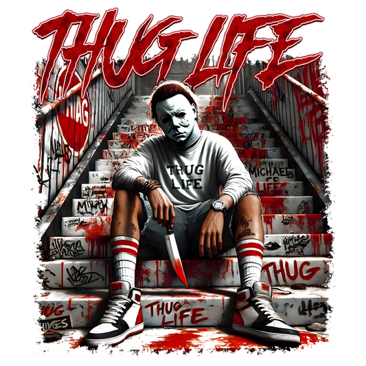 A striking illustration features a character in a "THUG LIFE" shirt, holding a knife, seated on graffiti-covered stairs. heat press transfers