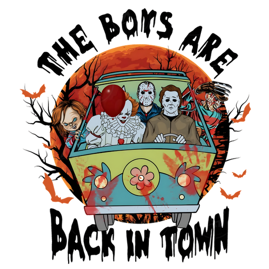 This vibrant, cartoonish design features iconic horror characters in a colorful van, with the text "The Boys Are Back in Town."