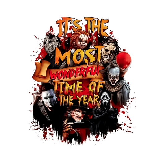 Celebrate Halloween with this vibrant graphic featuring iconic horror characters and the playful text, "It's the Most Wonderful Time of the Year." dtf transfers