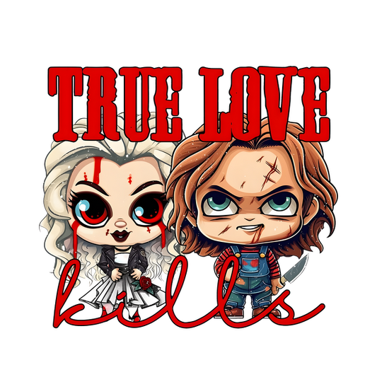 A whimsical illustration featuring two chibi characters with a dark theme, accompanied by the phrase "True Love Kills." dtf prints