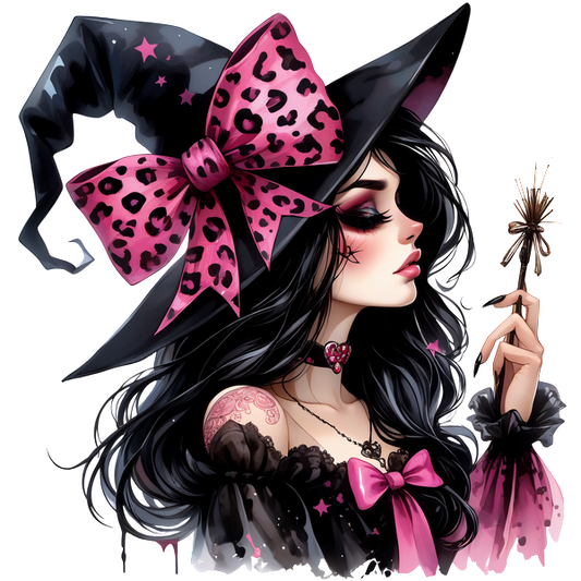 A stylish witch with a leopard print bow and dramatic makeup holds a wand, exuding a whimsical, enchanting vibe. dtf prints