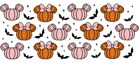 A whimsical pattern featuring cute Mickey Mouse-shaped pumpkins in pastel pink and orange with bows, ideal for autumn decor.UV Transfers dtf prints