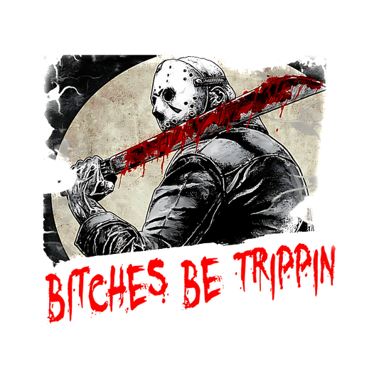 A bold graphic featuring a masked figure wielding a bloodied weapon, enhanced by the text "Bitches Be Trippin." heat press transfers