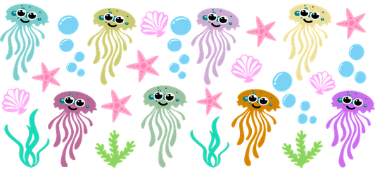 A playful underwater scene featuring colorful, cartoon-style jellyfish, starfish, and seashells surrounded by bubbles and seaweed.UV Transfers dtf prints
