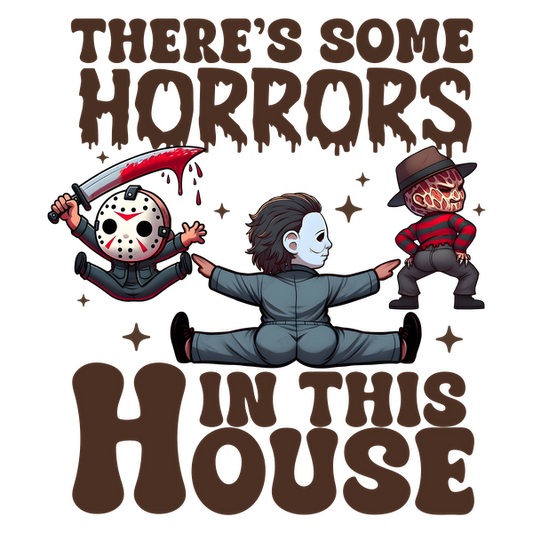 A playful design featuring iconic horror characters with the phrase "There's Some Horrors in This House," perfect for Halloween! dtf prints dtf prints