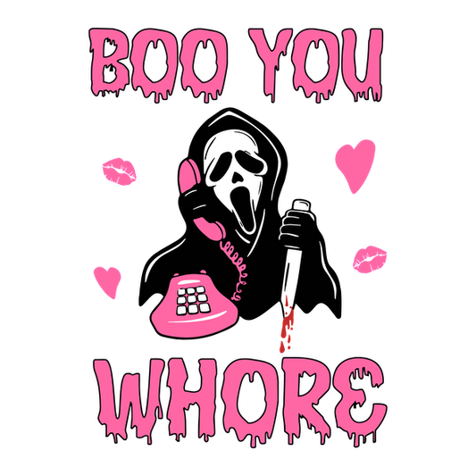 A playful Halloween-themed graphic featuring a ghostly figure with a phone and knife, highlighted by bold pink text.dtf regular iron