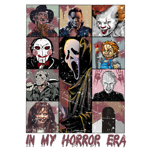 A vibrant collage featuring iconic horror characters like Freddy Krueger, Michael Myers, and Pennywise, celebrating the horror genre. dtf prints