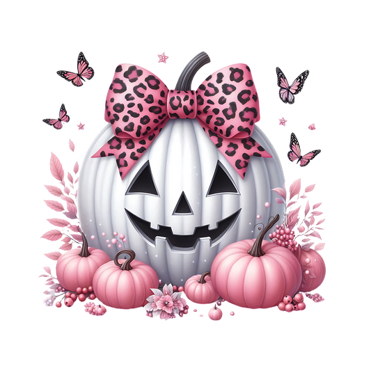 A whimsical Halloween scene featuring a white jack-o'-lantern with a leopard print bow, surrounded by pink pumpkins and butterflies.dtf regular iron