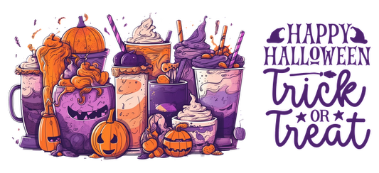 Celebrate Halloween with this colorful assortment of spooky drinks topped with sweet treats and playful pumpkins!UV Transfers dtf transfers