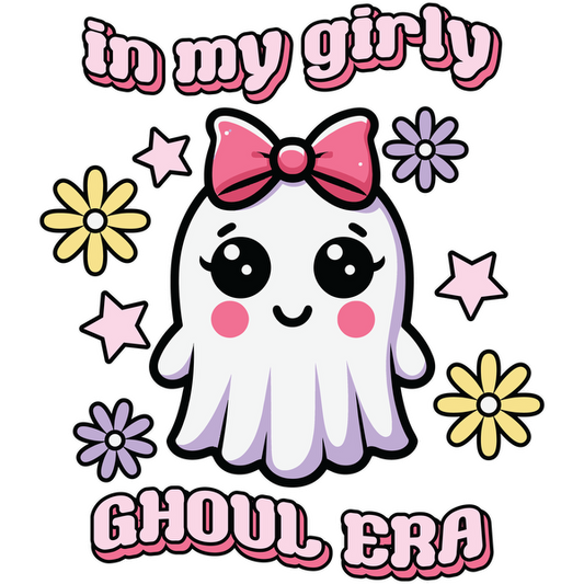 A cute, pastel ghost graphic with a bow, surrounded by flowers and stars, highlights the playful phrase "in my girly ghoul era." heat press transfers