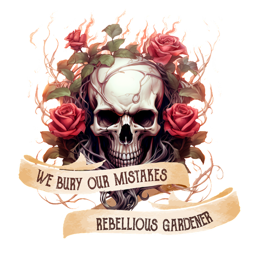 A striking design featuring a skull entwined with roses and vines, accompanied by the text "We bury our mistakes, Rebellious Gardener." dtf transfers